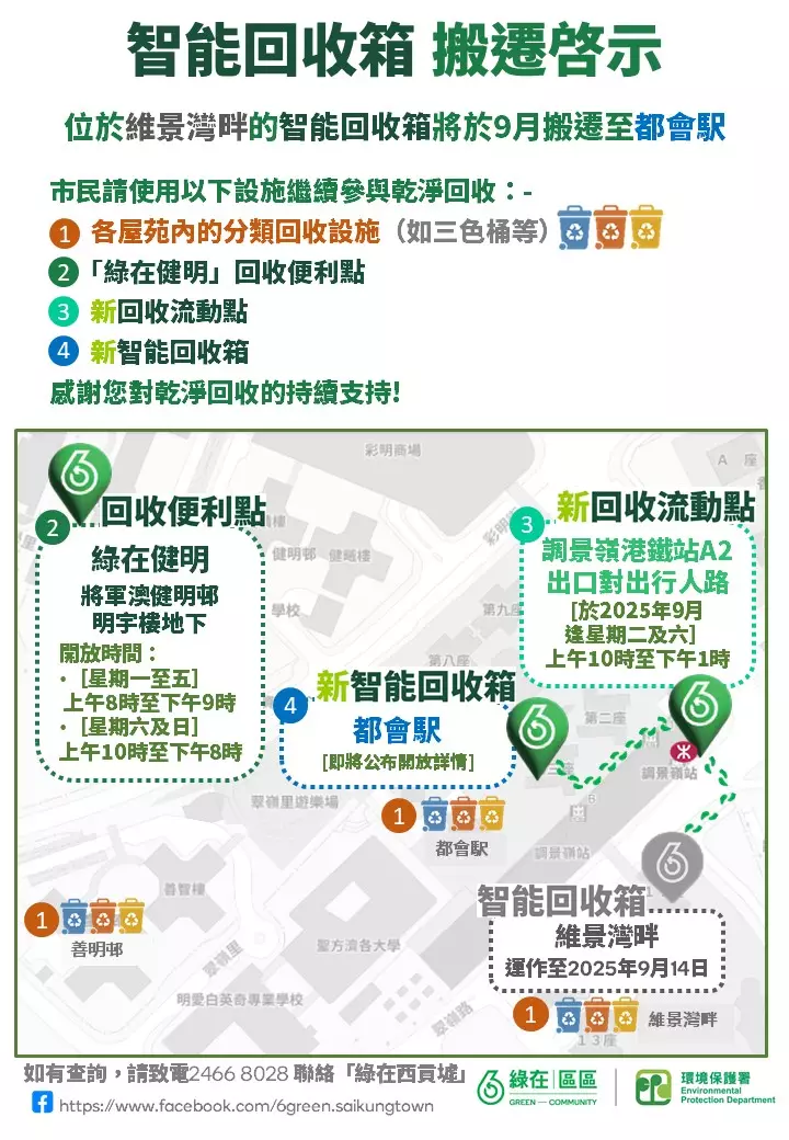 環保署指,位於調景嶺維景灣畔三期商場內,稱為「綠在西貢墟─調景嶺站」的智能回收箱,將於月中遷往鄰近的都會駅商場運作。