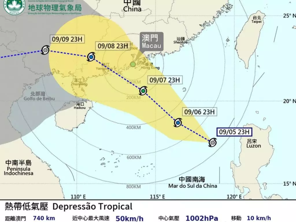 氣象局說,位於南海中部的熱帶低氣壓,未來一兩日會採取西北方向移動,並逐漸增強,大致移向廣東西岸,澳門星期日開始驟雨增多及有雷暴,風勢增強,星期日下午至晚間改發三號風球的機會較高。