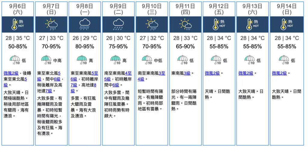 此外,1號戒備信號現正生效,並會在星期六大部分時間維持。而受熱帶氣旋影響,星期日風勢逐漸按照現時預測,該熱帶低氣壓會逐步增強並靠近廣東西部沿岸。天文台會視乎該熱帶氣旋的強度、其強風區與本港的距離及本地風力變化,評估是否需要在星期日初時改發3號強風信號。