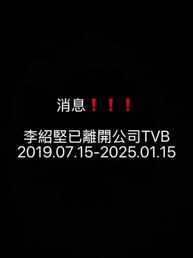 曾為TVB限定男團Super Tiger成員的李紹堅正式宣布已離巢,他撰文公開表示已離開TVB,又多謝一眾公司的同事。
