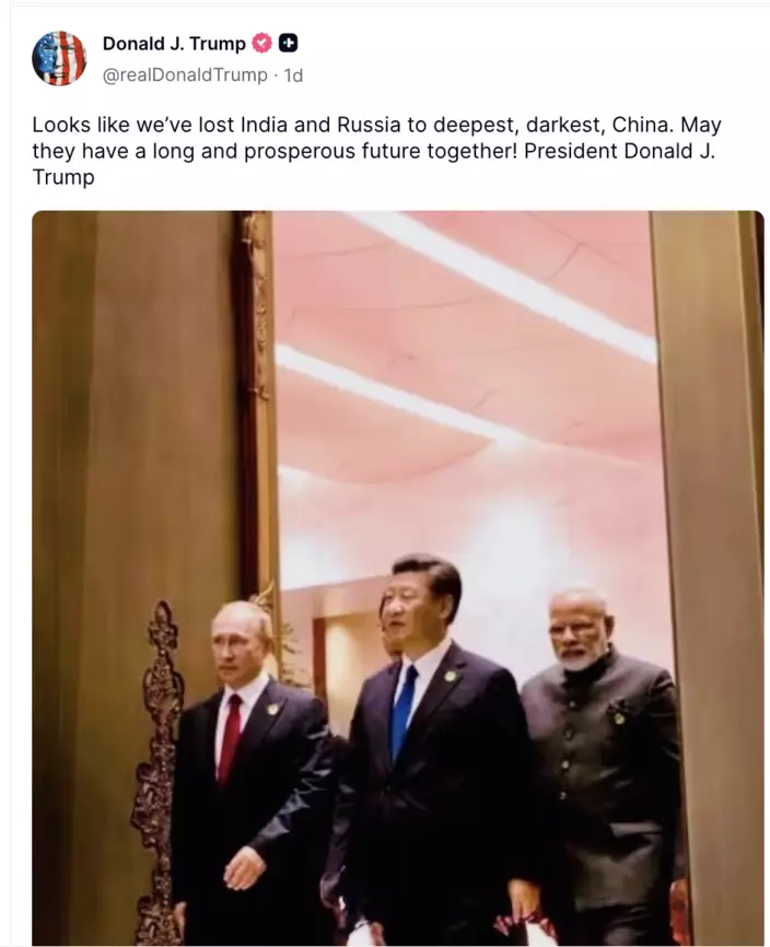 特朗普9月5日在帖文中,貼出中俄印領導人在上合峰會期間的合影,配文直指「看起來,我們好像把印度和俄羅斯輸給了中國。祝他們未來長久繁榮」,外界形容滿有「吃不到的葡萄是酸的」的味道。據路透社等媒體報道,特朗普此舉暗示俄羅斯與印度正逐漸向中國靠攏,而這種「被背叛」的感受,恰恰源於他本人此前對兩國施加的壓力。