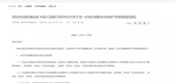 9月5日深夜,深圳市住房和建設局聯同中國人民銀行深圳市分行印發《關於進一步優化調整本市房地產政策措施的通知》