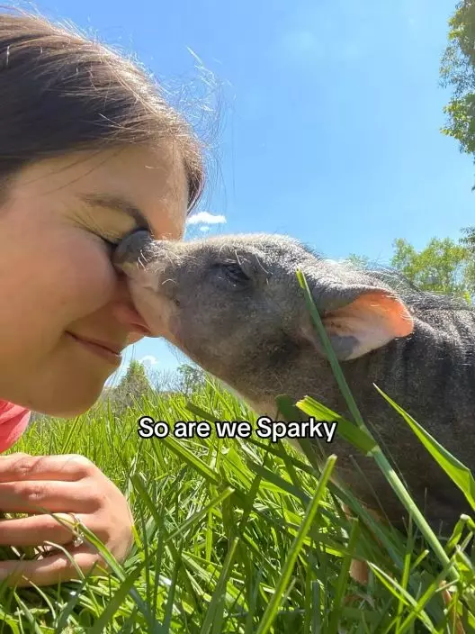 帕爾托夫十分心疼這隻小動物的境遇,於是立即將牠帶回庇護所悉心照。隨著時間推移,這隻「無毛小狗」的身份被逐步揭曉,牠其實是一隻貨真價實的小豬,體重僅約4至5磅,身上佈滿寄生蟲且患嚴重疥癬。不過,小豬的求生意志非常頑強,即使身體不適也十分活潑黏人。帕爾托夫決定替牠改名為「小火花」(Sparky),意指牠的性格如電力般充滿能量。