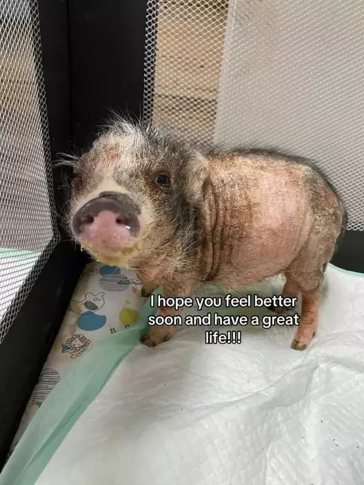 綜合外媒報導,美國動物救援組織「Sleepy Pig Farm 動物庇護所」創辦人蒂芬妮・帕爾托夫(Tiffany Paltauf)於數年前接獲來電求助稱,一隻小動物從某處地庫內被救出。帕爾托夫趕抵到場後發現,這隻小動物全身幾乎無毛,看上去瘦弱又虛弱,乍看像是一隻可憐的「無毛小狗」。