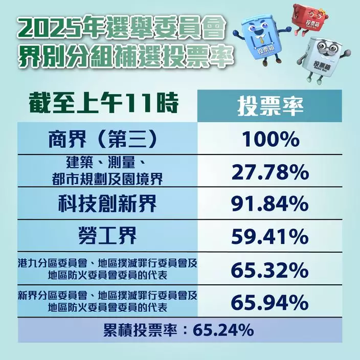 選舉管理委員會主席陸啟康表示,截至上午11時,投票率達到65.24%,有信心補選在公開公平及誠實的情況下順利完成,投票及點票工作能在合理時間內完成,又呼籲合資格選民行使權利,盡快投票。