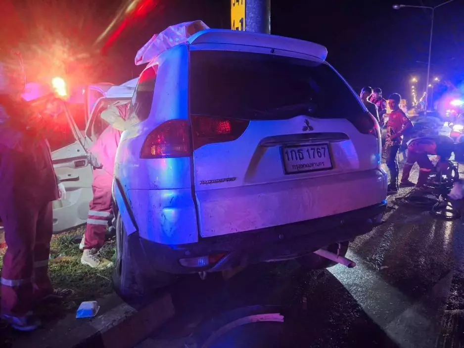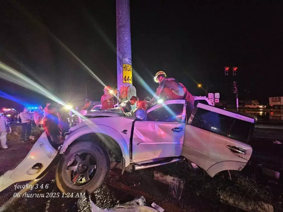 據泰媒報道,泰國大城府347號公路於9月6日凌晨發生一宗嚴重車禍,一輛白色三菱休旅車突然失控猛撞電線桿,車輛右側幾乎全毀,42歲男司機被移出車外時已無生命跡象,當場被判定死亡。