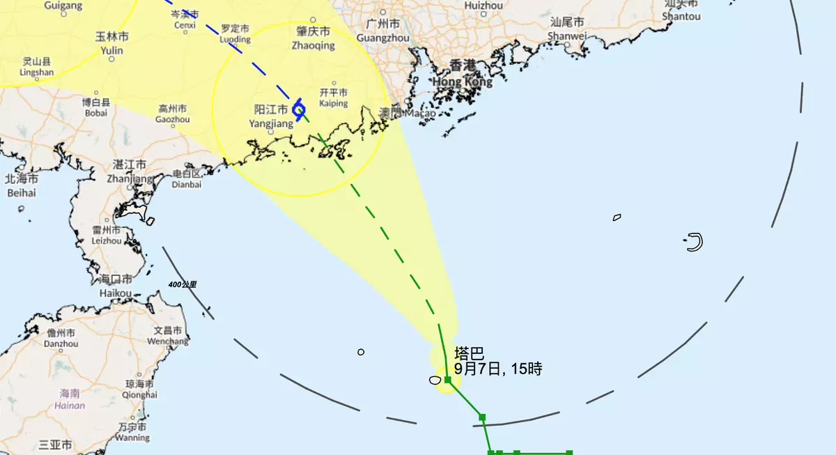 天文台指,過去兩三小時,塔巴穩定地向西北偏北方向移動,而其外圍雷雨帶正影響廣東沿岸。