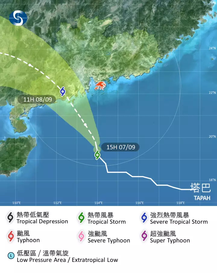 按照現時預測,塔巴會進一步增強並靠近廣東西部沿岸,在明早於香港西南面200公里內掠過。其烈風區將會逐漸影響珠江口一帶,本港風勢將逐步增強。天文台會考慮在今晚9時至午夜12時之間改發八號烈風或暴風信號。
