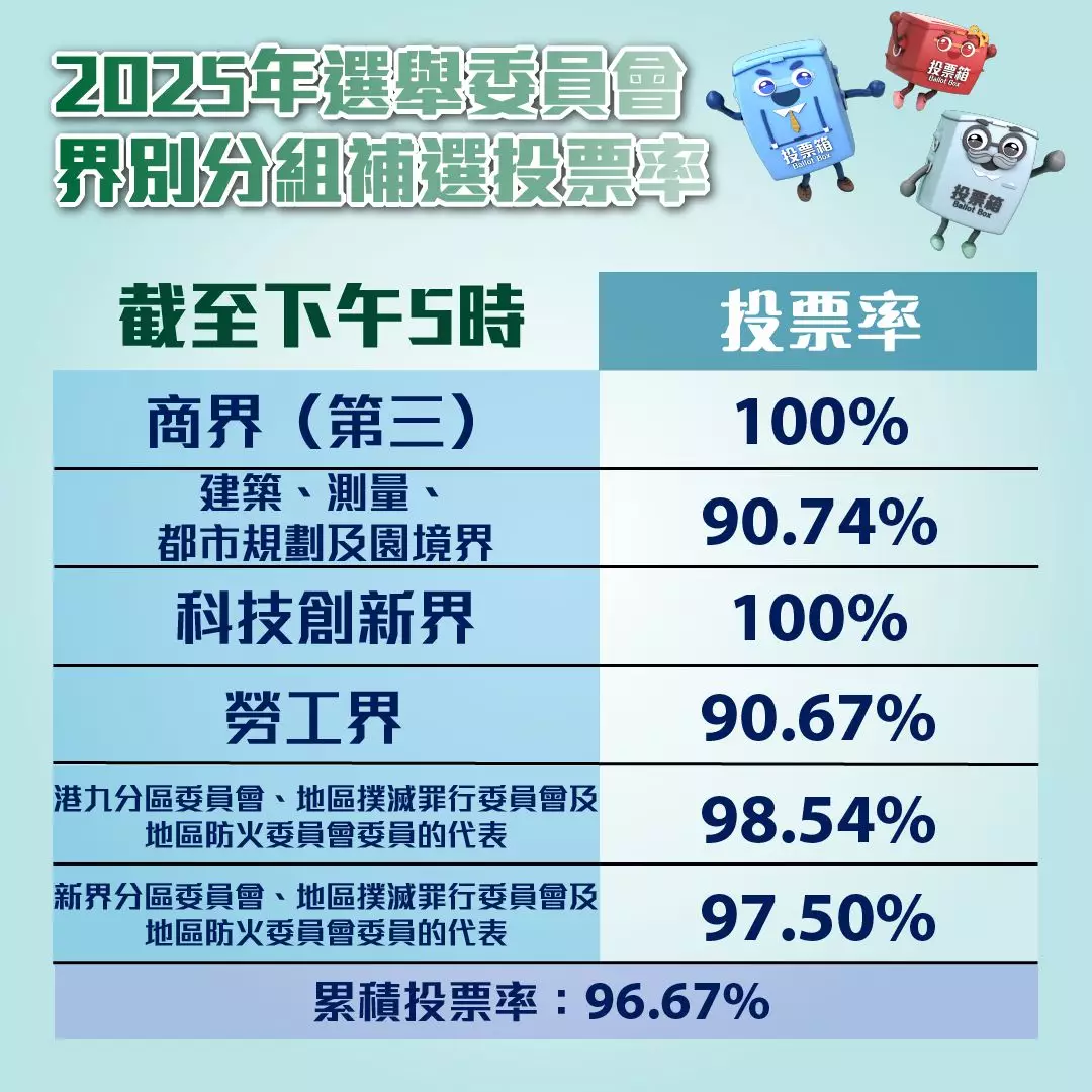 截至下午5時,投票率為96.67%。政制及內地事務局FB圖片