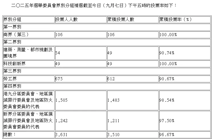 選舉委員會界別分組補選星期日(9月7日)舉行,截至下午5時,投票率為96.67%,3631名已登記投票人中,有3510人已投票。