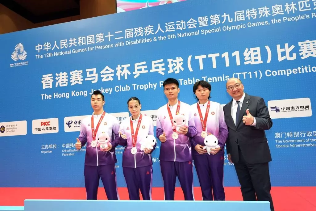 香港賽馬會公司事務執行總監譚志源(右一)向「殘特奧會香港賽馬會盃乒乓球(TT11組)比賽」混合雙打賽的獲獎運動員頒發獎牌。港隊乒乓球運動員溫偉樂(左一)、黃珮淇(左二)在這項比賽奪得銀牌,袁景誠(中)、王婷莛(右二)奪得銅牌。