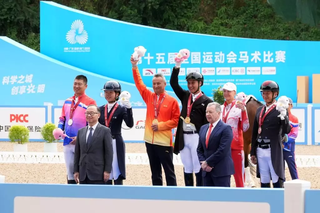 香港賽馬會主席廖長江(前排左)、行政總裁應家柏(前排右)向十五運會馬術賽事盛裝舞步個人賽的獲獎運動員頒發獎牌及紀念品。