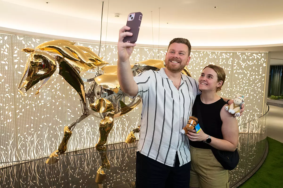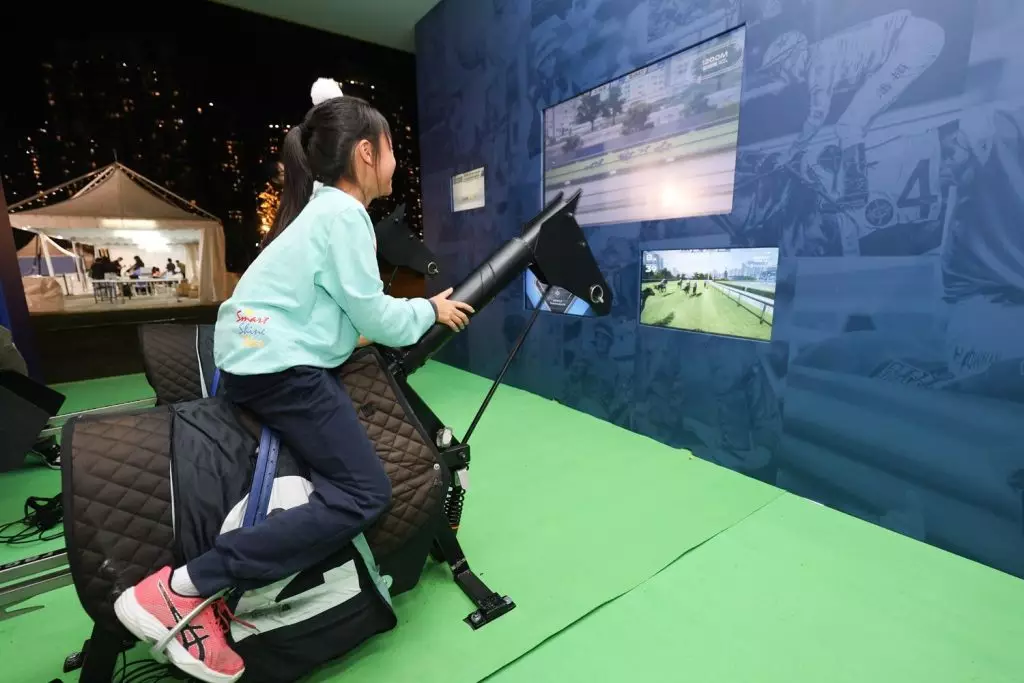 內地旅客張小姐與3D數碼技術還原的三屆香港馬王「金鎗六十」在虛擬馬房中互動
