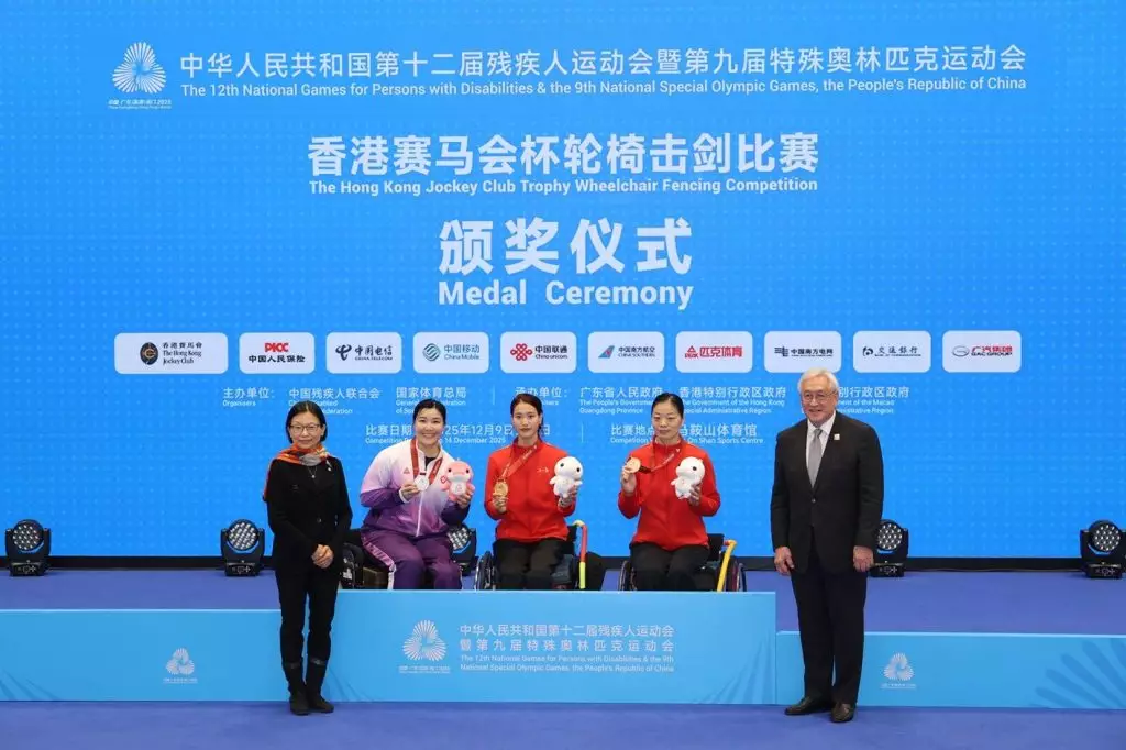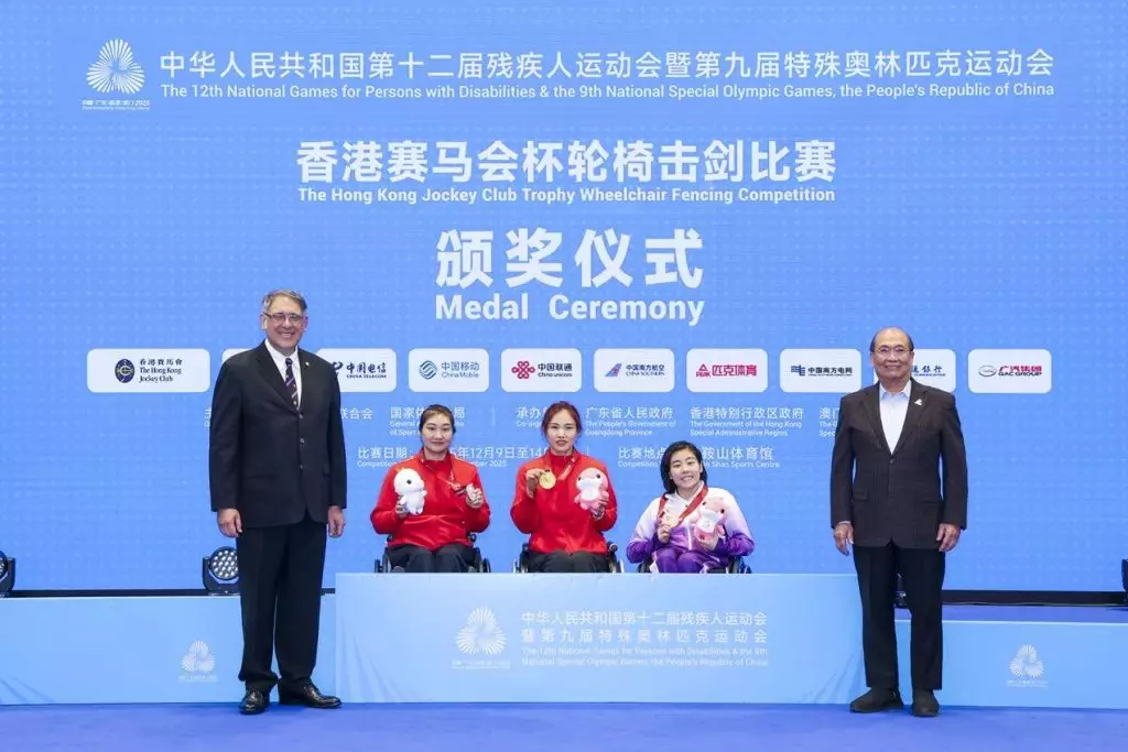 港賽馬會副主席黃嘉純(左一)向「殘特奧會香港賽馬會盃輪椅擊劍比賽」女子花劍B級個人賽的獲獎運動員頒發獎牌。港隊運動員湯雅婷(右二)在這項比賽奪得銅牌。