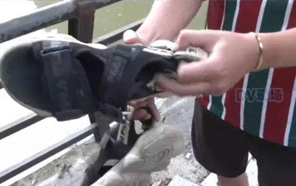 外賣員接單運送鱷魚遭咬爛鞋子。影片截圖