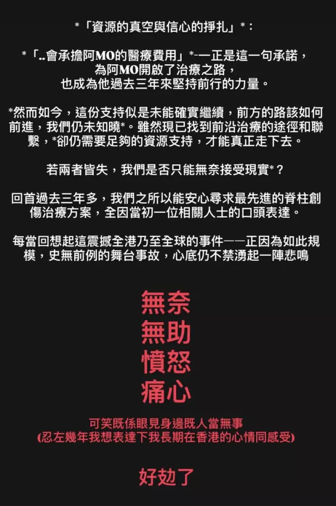 信中續道:「(一) *啟言 (Mo ):* 1) *「起初的治療判斷」*:還記得三年前阿MO出事後接受治療時,*兩位醫生的話給出了截然不同的判斷*。一位說:「阿MO這一生恐怕只能在床上度渡過」;另一位卻說:「未來兩三年,脊柱創傷的醫療技術一定會有重大突破,阿MO將有機會受惠於這些進展,甚至重新站起來。」*正是這句「有機會重新站起來」,為阿MO和我們帶來了希望與動力,而不是絕望的宣判。除了祈求上帝的醫治,我們也持續關注前沿科技在脊柱創傷治療上的發展,期待能為像阿MO這樣的患者帶來曙光*。因此,我們始終朝著這個方向祈禱,並積極尋找每一絲可能的出路。 2) *「資源的真空與信心的掙扎」*: *「…會承擔阿MO的醫療費用」*——正是這一句承諾,為阿MO開啟了治療之路,也成為他過去三年來堅持前行的力量。 *然而如今,這份支持似是未能確實繼續,前方的路該如何前進,我們仍未知曉* 。雖然現已找到前沿治療的途徑和聯繫, *卻仍需要足夠的資源支持,才能真正走下去。若兩者皆失,我們是否只能無奈接受現實* ?回首過去三年多,我們之所以能安心尋求最先進的脊柱創傷治療方案,全因當初一位相關人士的口頭表達。每當回想起這震撼全港乃至全球的事件——正因為如此規模,史無前例的舞台事故,心底仍不禁湧起一陣悲鳴。 3) *「治療安排的多次受挫」*: 在安排治療的過程中,有好幾次我們以為一切已經準備妥當,最終卻仍不得不耗費大量心力、時間,甚至金錢,重新調整行程,再度等待出發的時機。最令人困擾的是,相關的治療用品和器材早已備齊,而其中部分物品若未能在預期時間內使用,便會失去原有的功能與療效。*儘管一切或許可以重頭開始,但那種失落與無奈,那種原本期待能夠更進一步的康復願景,彷彿在瞬間失去了方向,令人倍感徬徨無措*。 *(二) Mo爸媽:【生命經歷體驗分享】:患得患失的陪伴旅程* 昨日凌晨二時許,再度經歷了一個令人緊張卻又無奈的時刻。原本的護理人員尚在,外聘的護理卻突然失聯。正急需人手處理阿MO的需要時,卻不見其人影。*身為父母,我們雖從未嘗試過協助處理「放大便」事宜,但當時也只能親自動手。在阿MO的指引下,幸好最終順利完成,那時已是凌晨三時多了*。 隨著阿Mo 治療過程的變化,我們深刻體會到上帝無條件的愛與拯救大能,更感謝神和你們的記念 - *「163:走著一波三折醫治之路」*」