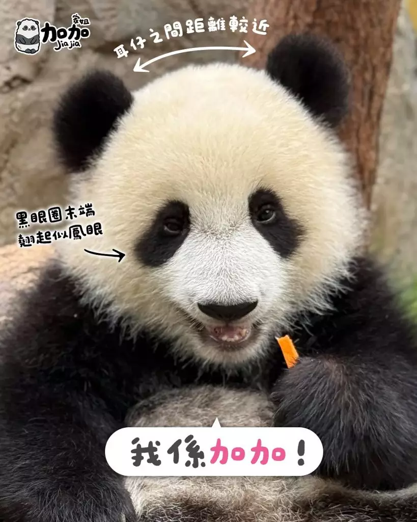 海洋公園大熊貓「加加」同「得得」向來好似樣,即便是熟悉佢哋的熊貓迷,亦都好難一眼分辨出兩姐弟。今次海洋公園小編就教埋大家分辨嘅小Tips,熊貓版「猜猜我是誰」由家姐「加加」率先登場,原來「加加」耳仔之間距離較近,黑眼圈末端翹起似足鳳眼。至於「得得」就耳仔之間距離較遠,一對標誌性黑眼圈同家姐比更加圓潤。
