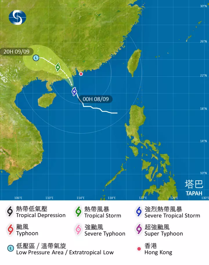 八號東南烈風或暴風信號,現正生效,並至少會維持至星期一早上11時。