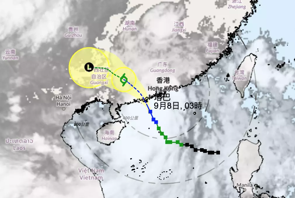 烈熱帶風暴「塔巴」會在日出前後於香港西南面200公里內掠過,隨後在廣東西部登陸。