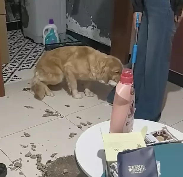 從社交平台的影片中可以看到,只見凌亂的客廳堪比颱風過境,主人手上拿著工具,正嚴厲的看著闖禍的金毛。