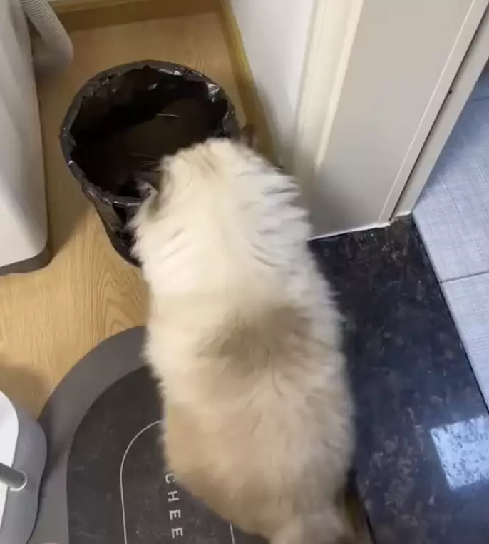 飼主透露,這隻布偶貓特別鐘愛垃圾桶。影片截圖