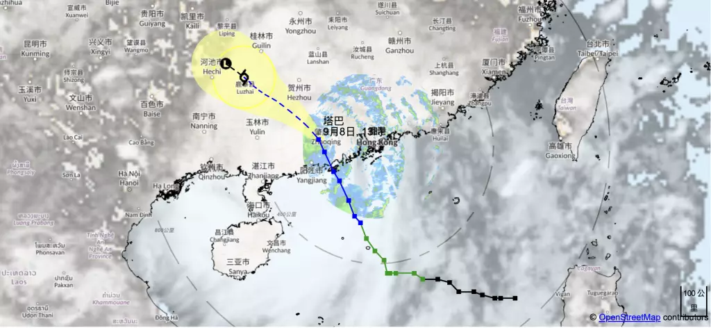 塔巴的雨帶星期一會繼續為珠江口帶來狂風驟雨及雷暴,雨勢有時頗大。海有大浪及湧浪,市民請遠離岸邊及停止所有水上活動。