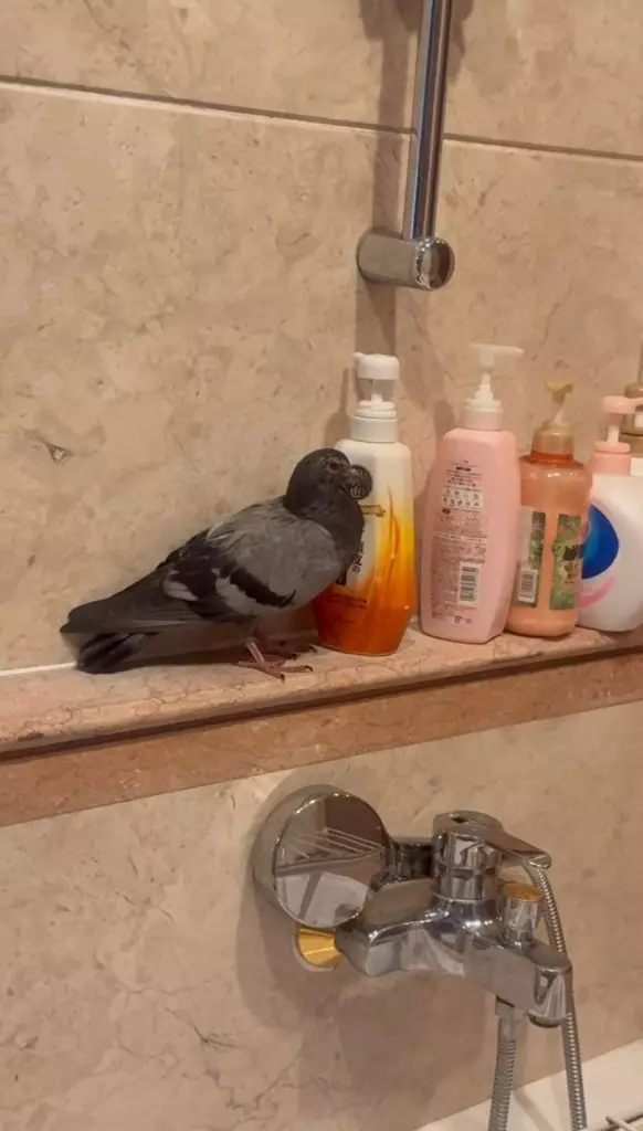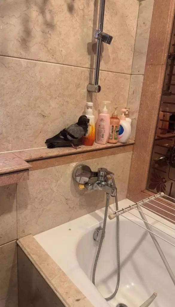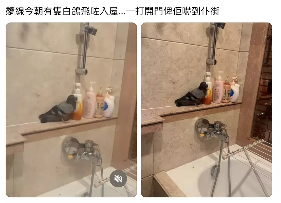 事主於家中浴室驚見鴿子闖入,隨即於社交媒體發文直言「黐線今朝有隻白鴿飛咗入屋」,並附上現場照片。從圖中可見,一隻生勾勾的鴿子站在浴室擺放洗髮水和沐浴露的架子上,頭部竟緊貼洗髮水瓶,場面看似滑稽,卻讓事主嚇得魂飛魄散,更稱「一打開門俾佢嚇到仆X!」
