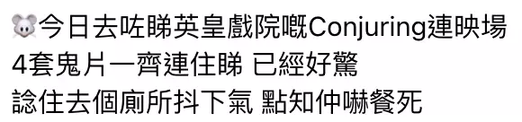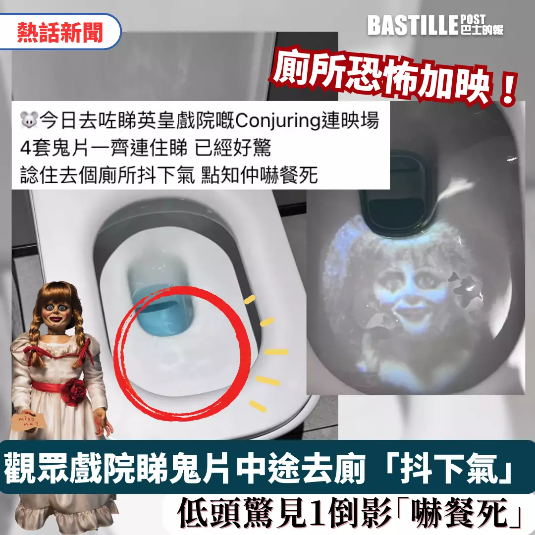 事主表示,日前在英皇戲院觀看《詭屋驚凶實錄》系列連映場時,中途想去洗手間「抖下氣」,沒想到一低頭,竟在馬桶水面上看到「詭娃安娜貝爾」的倒影!原來,這是戲院特別設置的投影效果,但突如其來的驚嚇仍讓事主哭笑不得,直呼「去個廁所都要咁大整蠱?」。