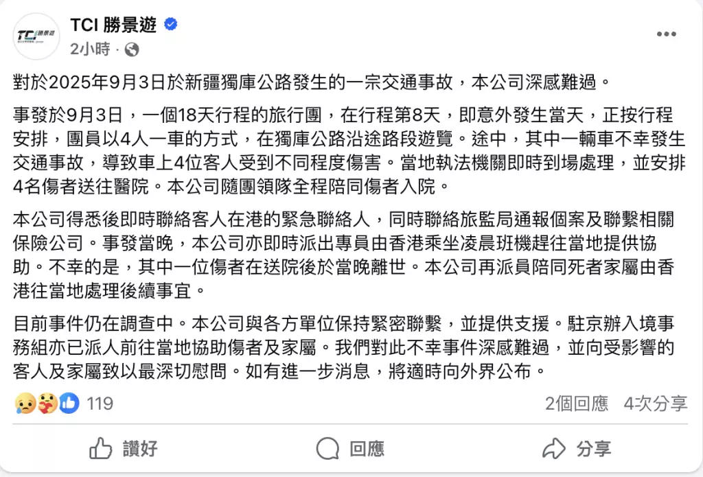 旅行社勝景遊一個前往新疆的旅行團,星期三在獨庫公路發生交通意外,1名團友死亡,3人受傷,傷者目前正在當地醫院留醫。勝景遊指,事件仍在調查中,會與各方單位保持緊密聯繫,並提供支援。