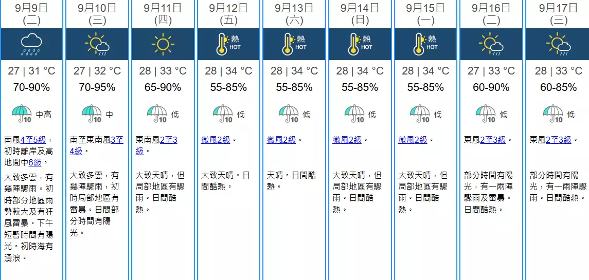 並展望星期三(9月10日)天色好轉,但仍有幾陣驟雨。隨後數日大致天晴及酷熱。