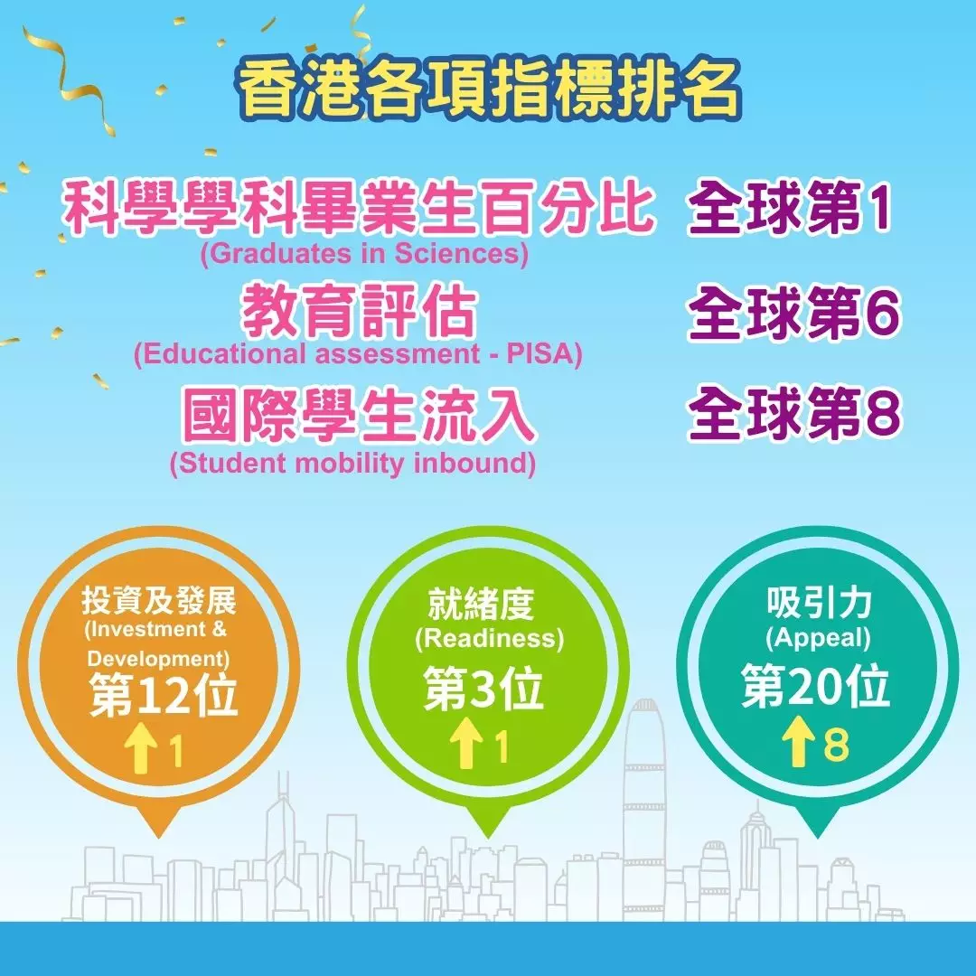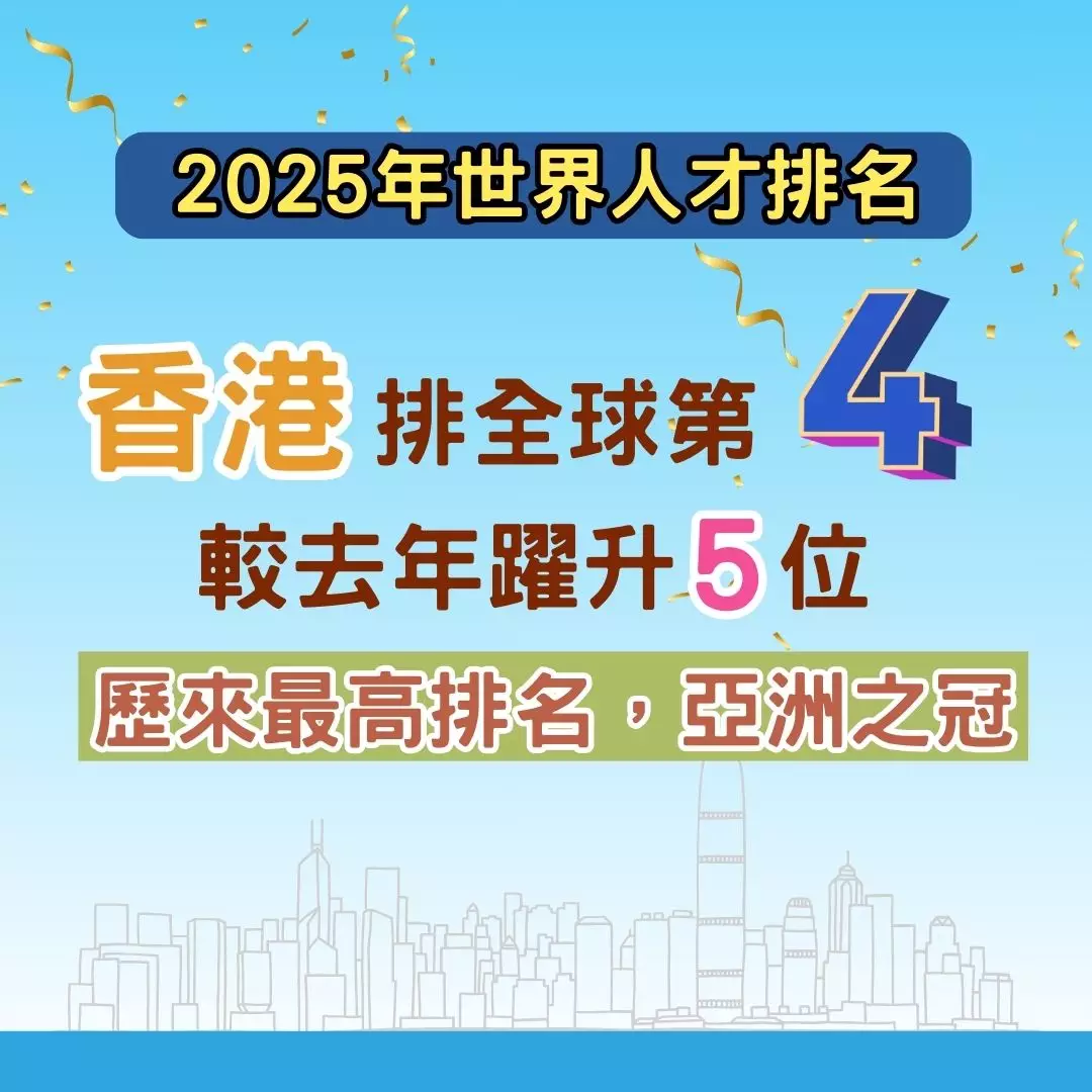 國際管理發展學院公布《2025年世界人才排名》,香港由去年的第九位躍升至第四位,位列亞洲首位,是本港歷來最高排名。教育局局長蔡若蓮表示,排名充分肯定特區政府近年在教育、創新科技及引進人才方面的政策方向和努力,並積極打造「留學香港」品牌,吸引各地優秀學子來港升學。