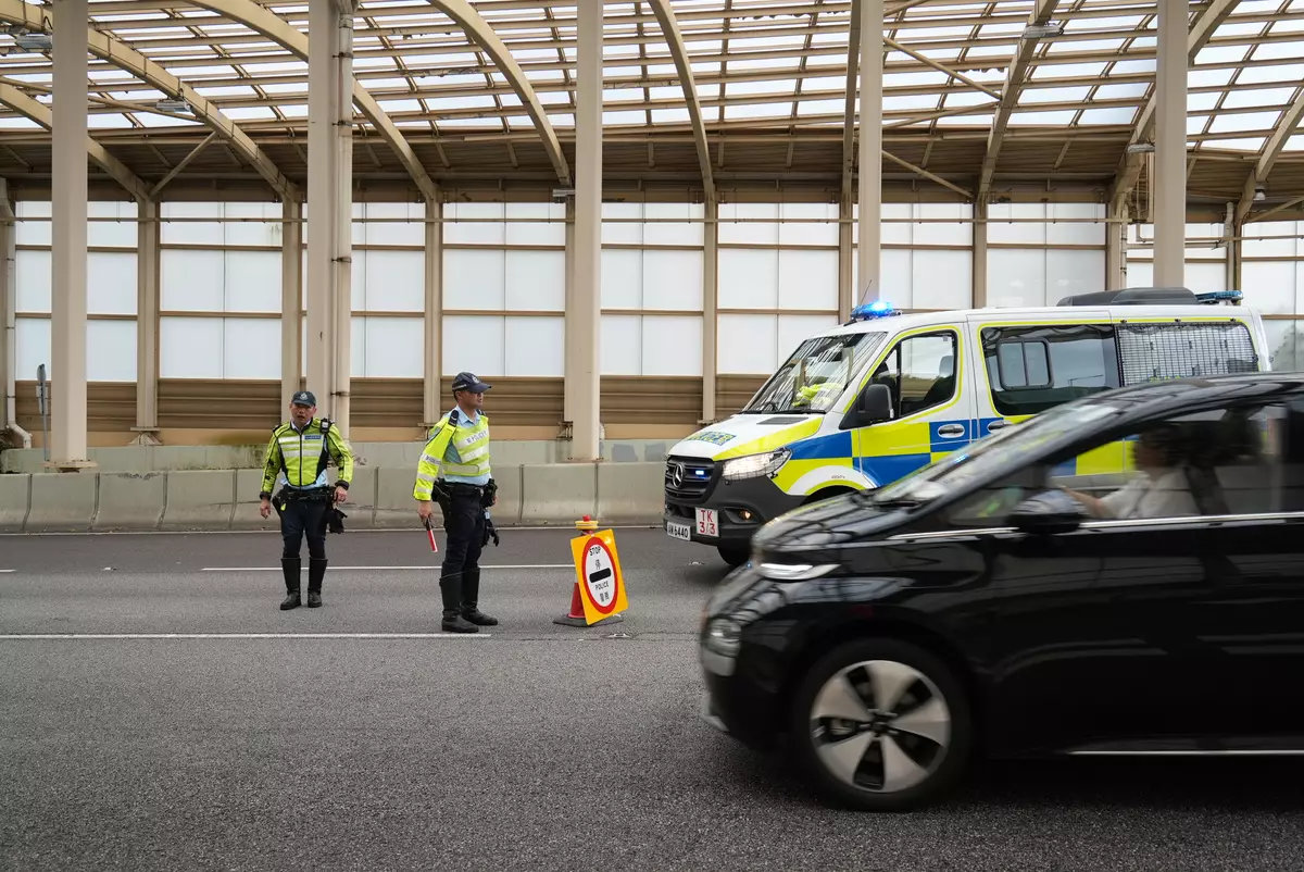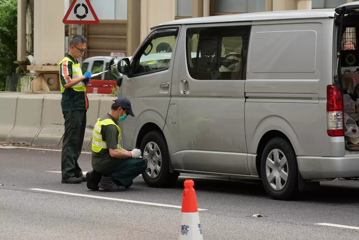 記者在現場見到有客貨車被人員攔下,檢查車內情況。(巴士的報記者攝)