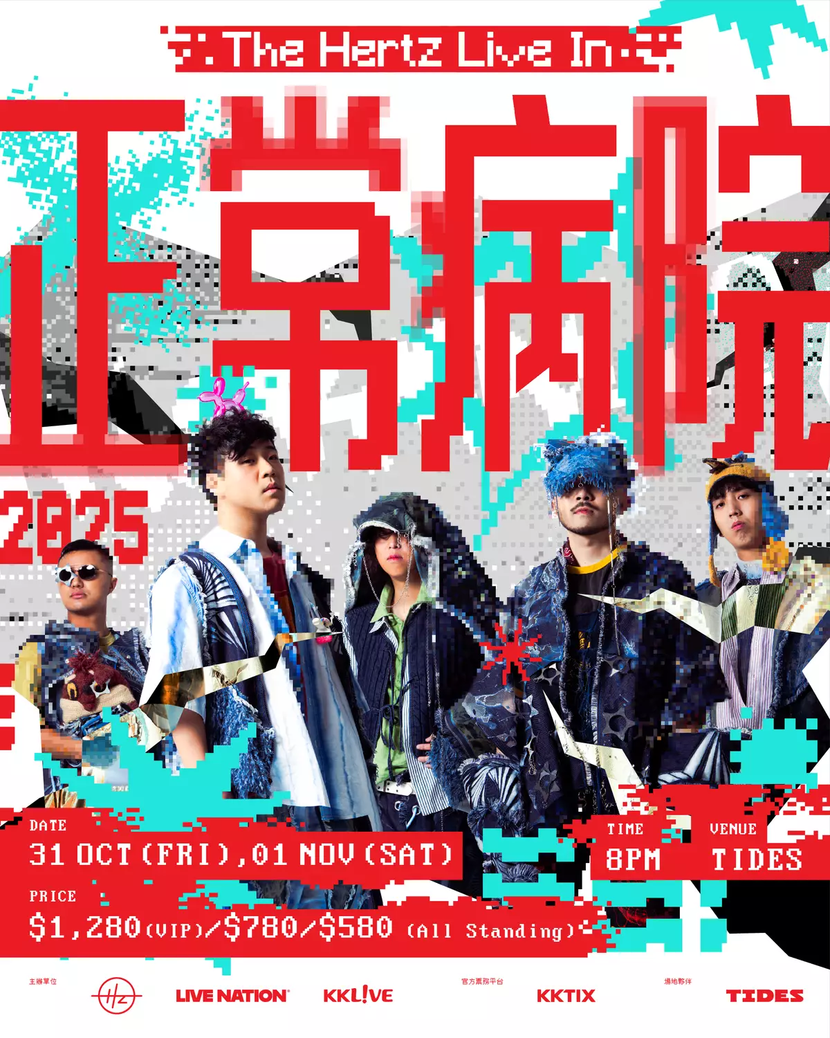 由Live Nation及KKLIVE主辦的獨立樂隊The Hertz《The Hertz Live in 正常病院 2025》一連兩場演唱會,日前在Live Nation旗下全新場地TIDES圓滿舉行,「病院」光榮結業!The Hertz大膽以社會現象為題,將TIDES化身為一間「正常病院」,並以四大病徵:「正常病」、「正義病」、「孤獨病」及「善忘病」四大幕,為全場樂迷進行了一場酣暢淋漓的集體「診斷」,帶領觀眾進入一場荒誕而直擊心靈的集體診療旅程。