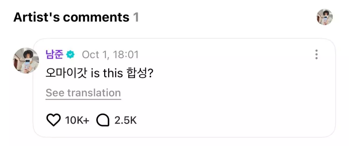RM隨後在Weverse也對這張同框照驚訝回應。Weverse截圖