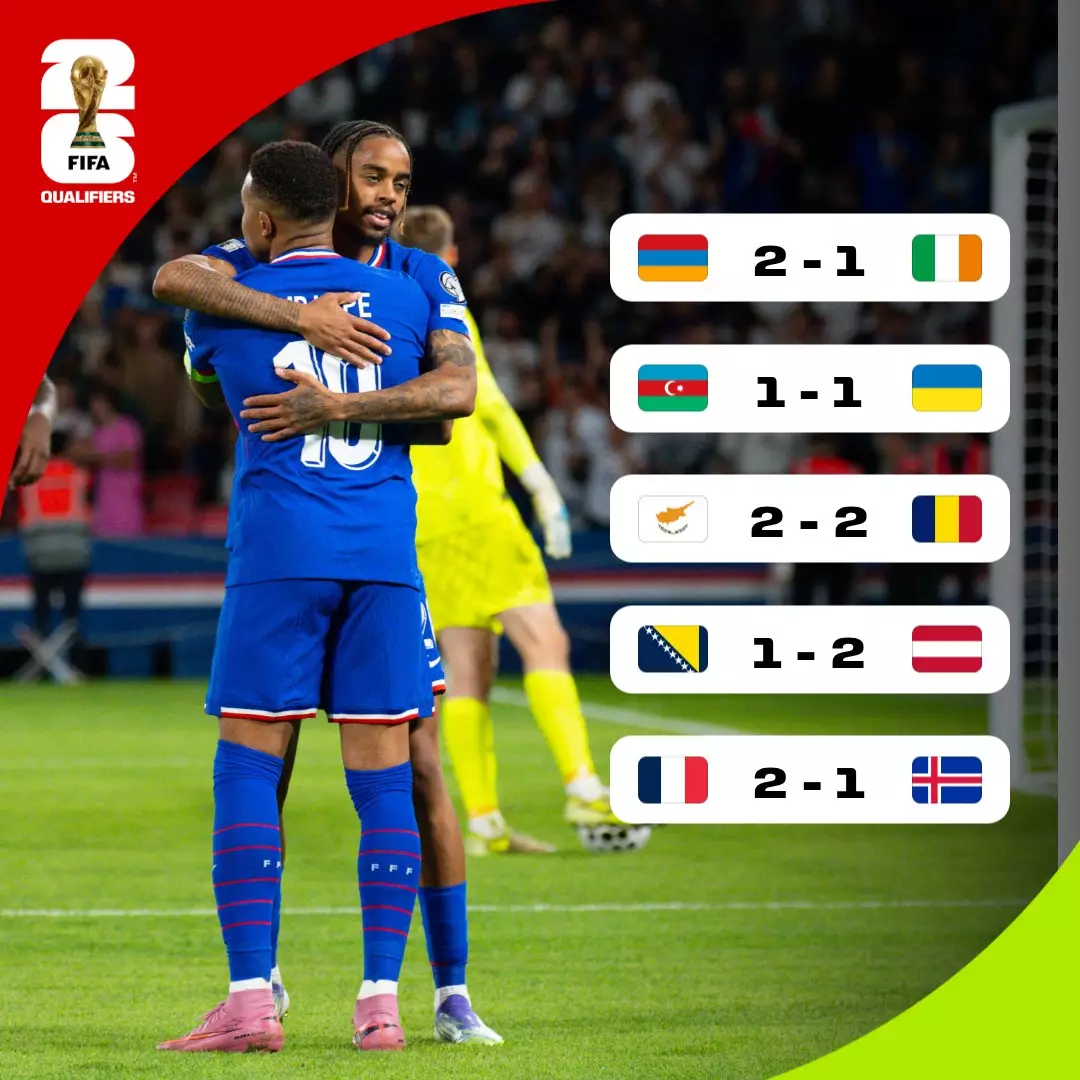 世界盃歐洲區外圍賽,英格蘭、葡萄牙和法國分別擊敗對手。FB圖片@FIFA World Cup