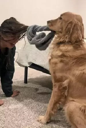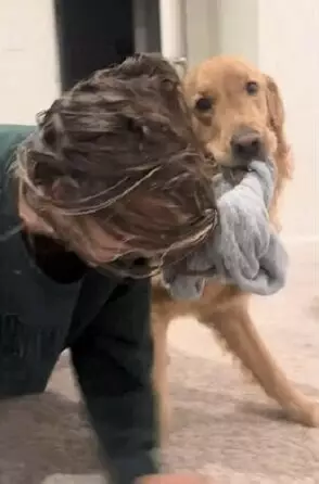 黃金獵犬誤將飼主擦頭巾當玩具緊咬不放