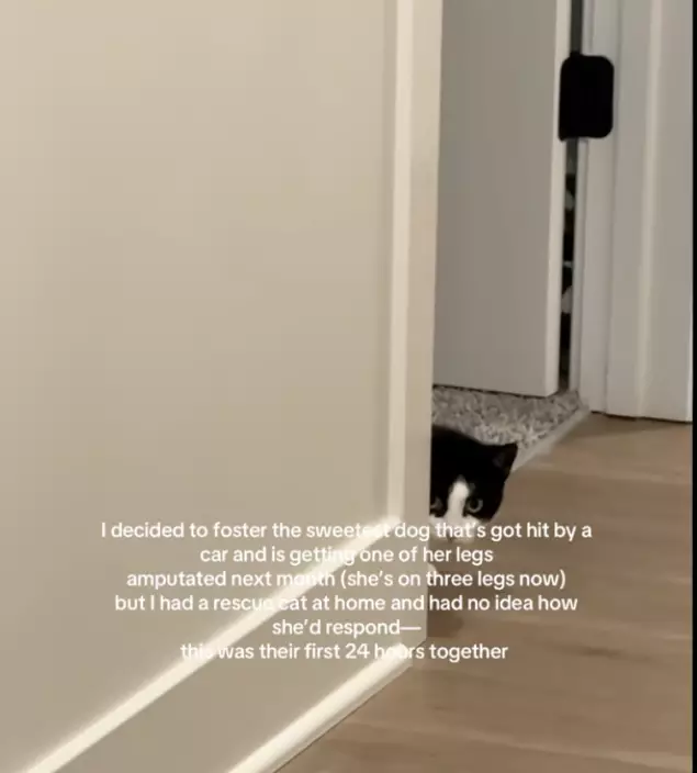 影片可見,賓士貓起初展現出典型警戒姿態,蹲守在走廊轉角豎起耳朵並以銳利眼神遠遠觀察這隻陌生狗狗。觀察了一段時間後,賓士貓察覺對方身上似乎帶傷後,態度逐漸軟化。當晚,牠便主動靠近並輕蹭新成員示好,尾巴還高高舉起,翌日更大方翻肚與新成員親暱打鬧。