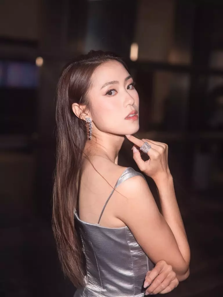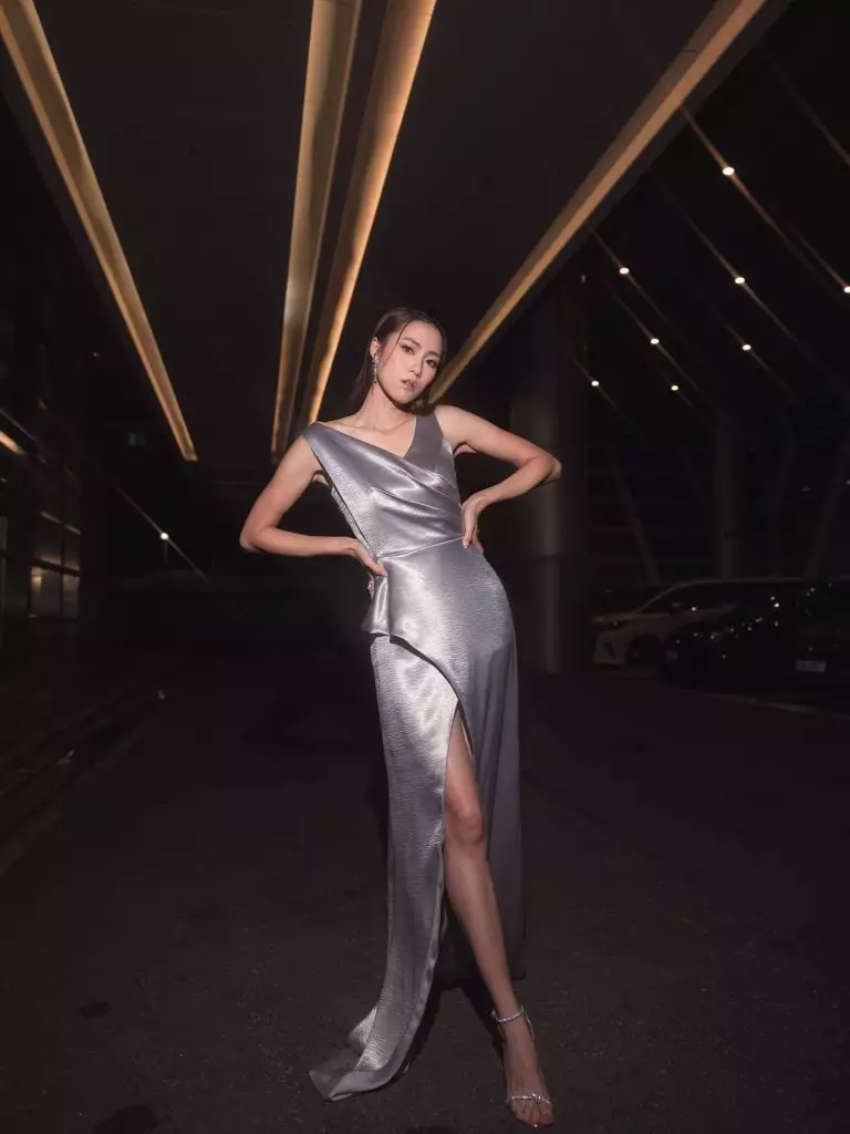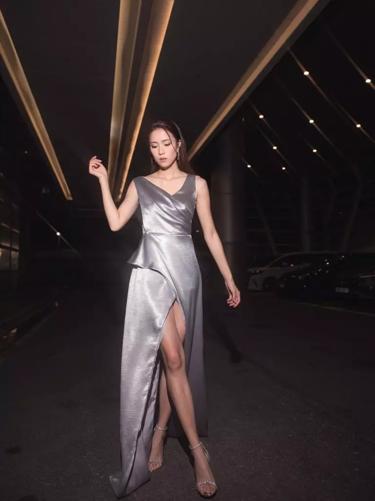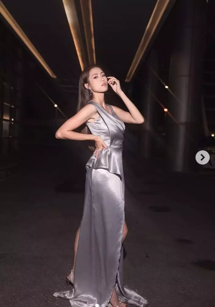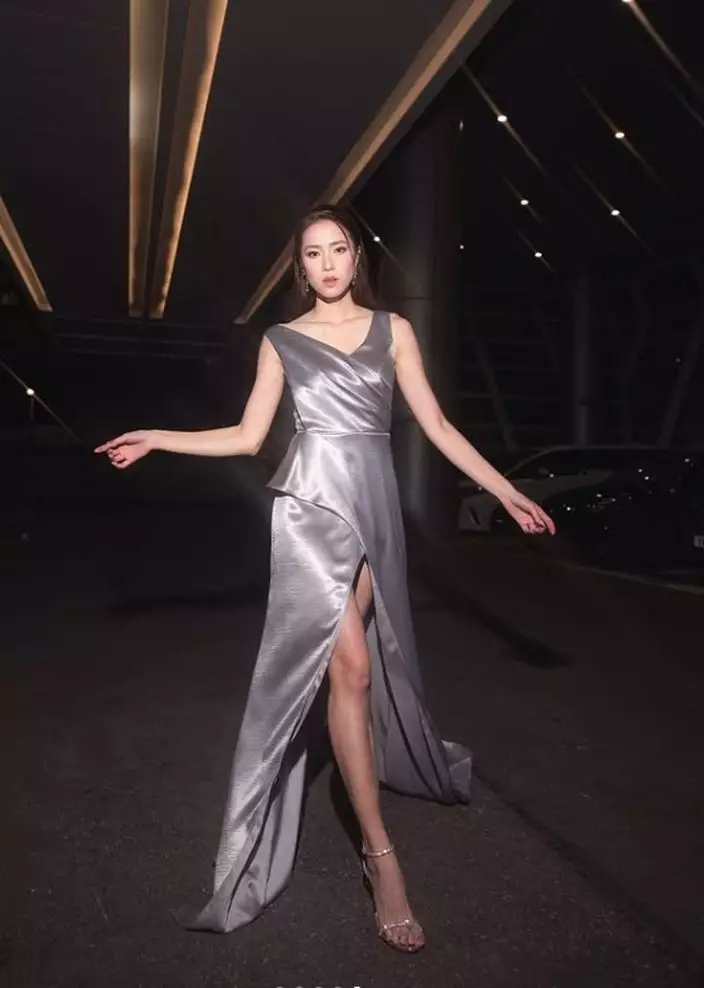Tiffany身穿銀色吊帶高衩裙。