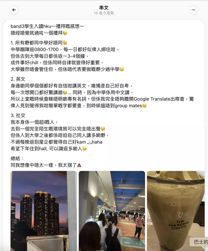 日前,一名由Band 3中學成功升讀香港大學的大學新生就在網上發帖,指自己開學一個星期已感到焦慮,他並列舉自己面臨的三大困難,坦言「同我想像中唔太一樣」。