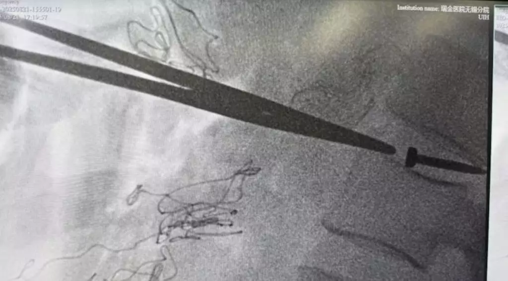 醫院檢查顯示,這枚金屬釘自腹壁貫穿途經肝臟左葉、胃壁、結腸系膜、十二指腸及後腹膜,最終嵌入腰椎間盤。醫生坦言,若處理稍有不慎,隨時可能引發膽瘺及腸瘺等嚴重併發症,甚至可能危及生命。