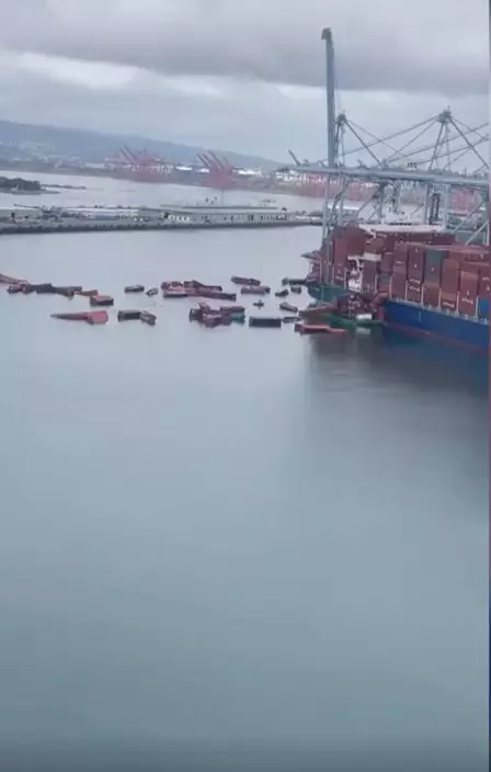 美國加州長灘港約67個貨櫃不明原因墮海猶如「骨牌效應」般,港口人員即時停工處理。
