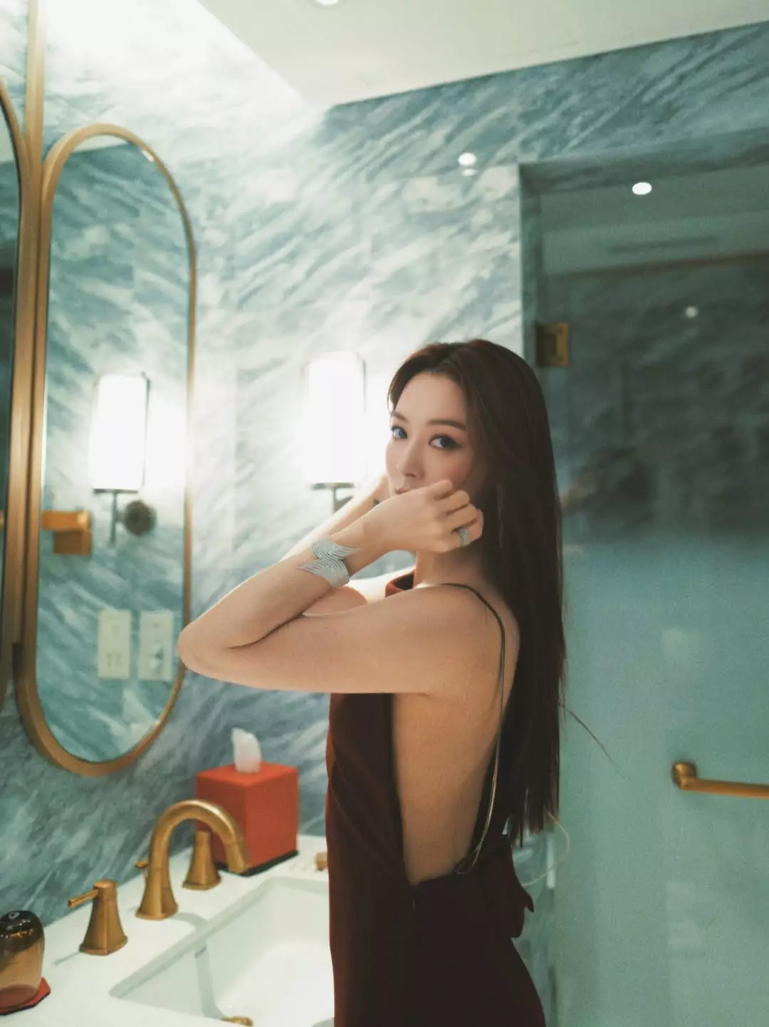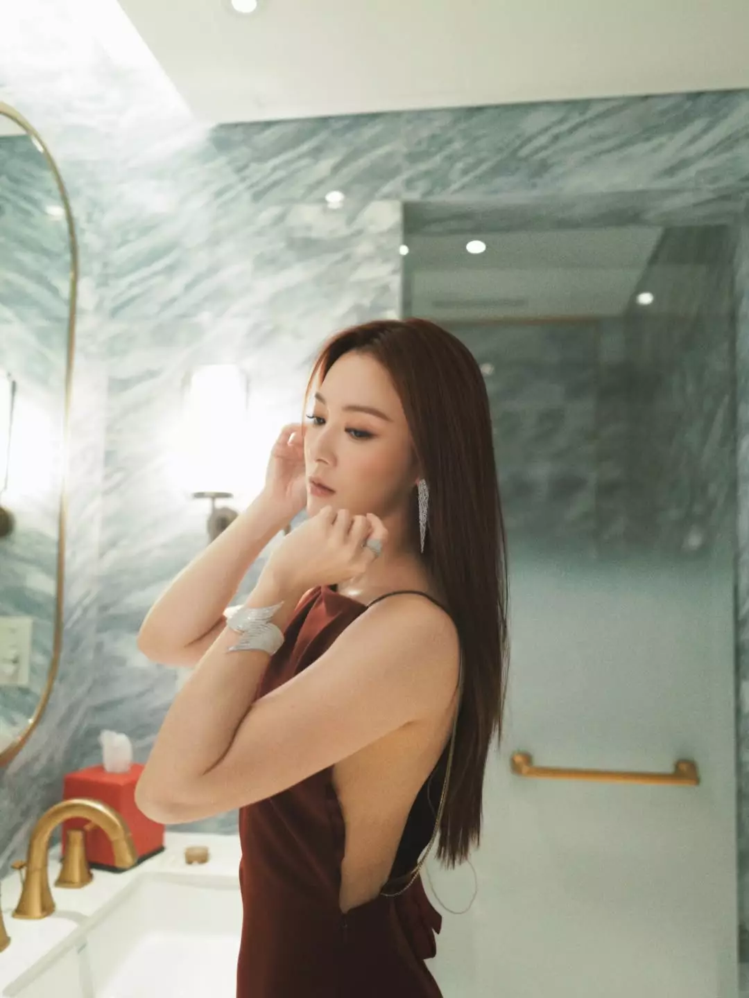 王敏奕以一頭飄逸直髮示人,搭配剪裁俐落的晚裝。