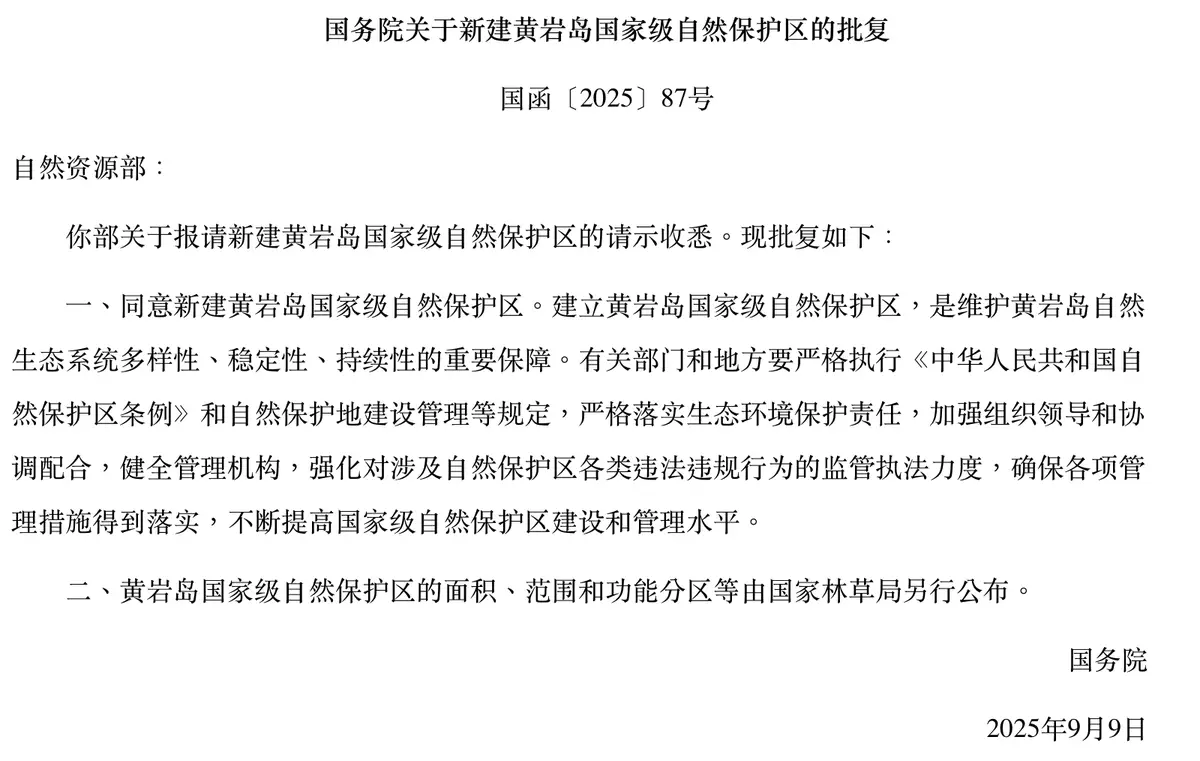批復指出,黃岩島國家級自然保護區的面積、範圍和功能分區等由國家林草局另行公佈。