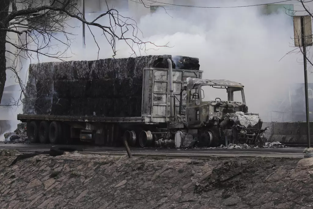 一名消防員用水管向燒毀的卡車噴射滅火。AP圖片