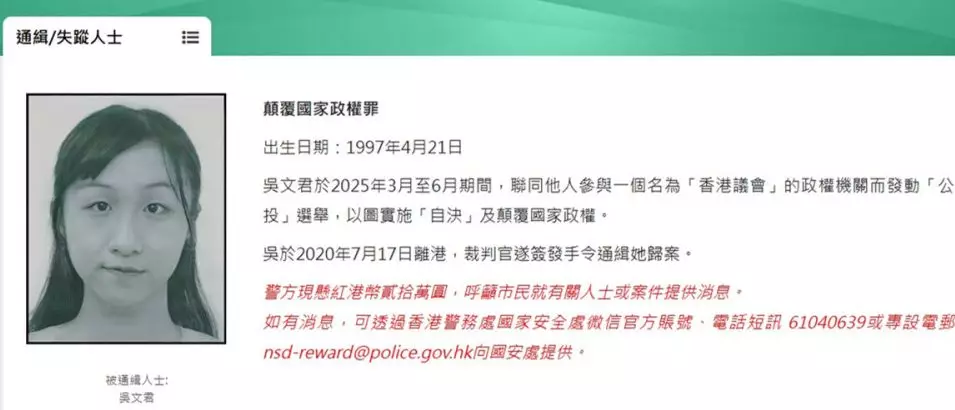 今年7月25日,警方國安署公布懸紅通緝19名境外人士,他們分別被指籌組名為「香港議會」的組織及參選「香港議會」,涉違反《國安法》下的「顛覆國家政權罪」,當中包括吳文君。