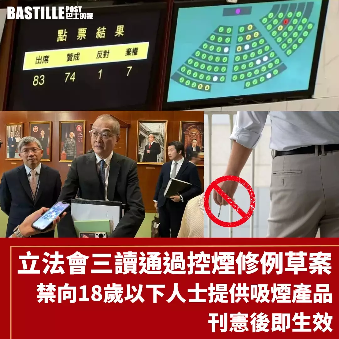 政府提出包括「控煙10招」的《2025年控煙法例(修訂)條例草案》在立法會以74票贊成、1票反對、7票棄權下獲三讀通過。醫務衞生局局長盧寵茂指,為防止年輕一代吸煙,禁止向18歲以下人士提供所有吸煙產品,將提前在修例刊憲之後正式生效。