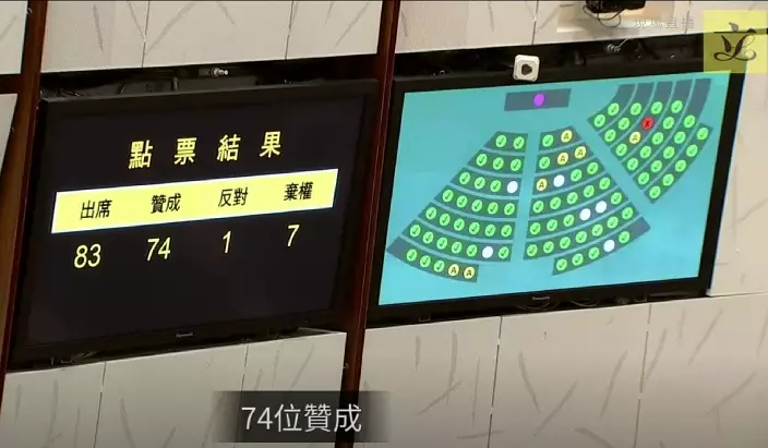 在席議員共83人,投反對票者為選委會議員江玉歡;7票棄權分別來自選委會議員林筱魯及謝偉俊;自由黨邵家輝、李鎮強和易志明;香港新方向的張欣宇及實政圓桌田北辰。