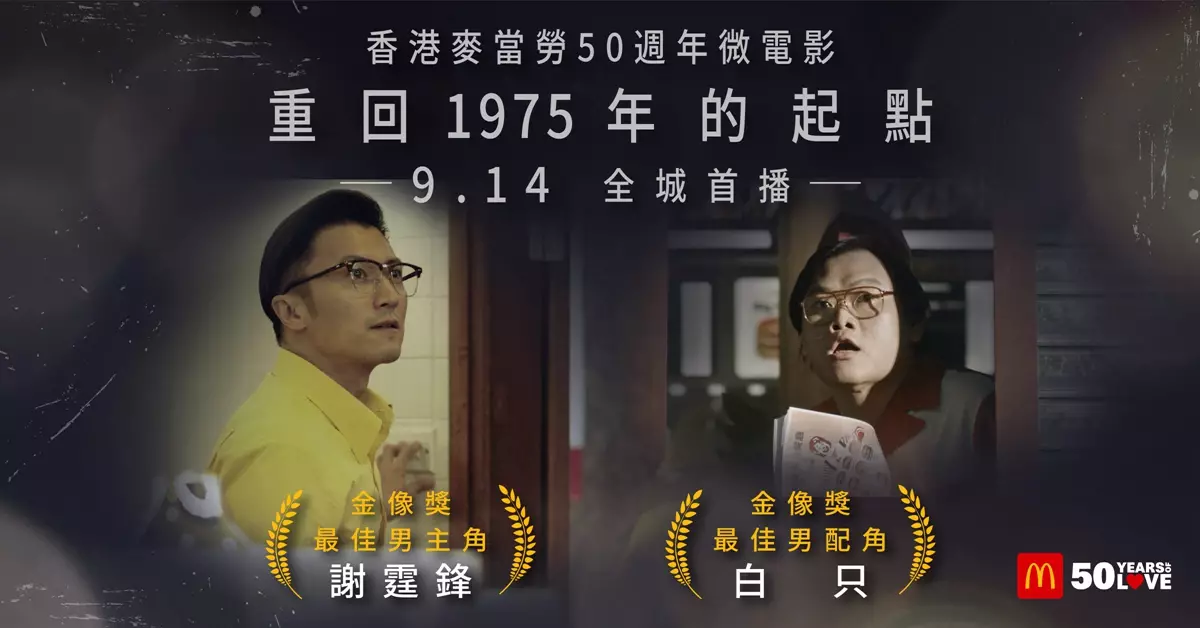 今年香港麥當勞50週年,史無前例集合本地金像級電影演員--金像獎最佳男主角謝霆鋒及最佳男配角白只,以及屢獲金像獎殊榮的電影級製作班底攜手合作,傾力打造由真人真事改編的微電影《重回1975年的起點》。微電影將真實還原當年第一間登陸香港的餐廳舊貌及銅鑼灣百德新街的街景,邀請大家與謝霆鋒、白只一起重回香港麥當勞的起點,以精湛演技和精細製作細訴陪伴香港半世紀的品牌故事。