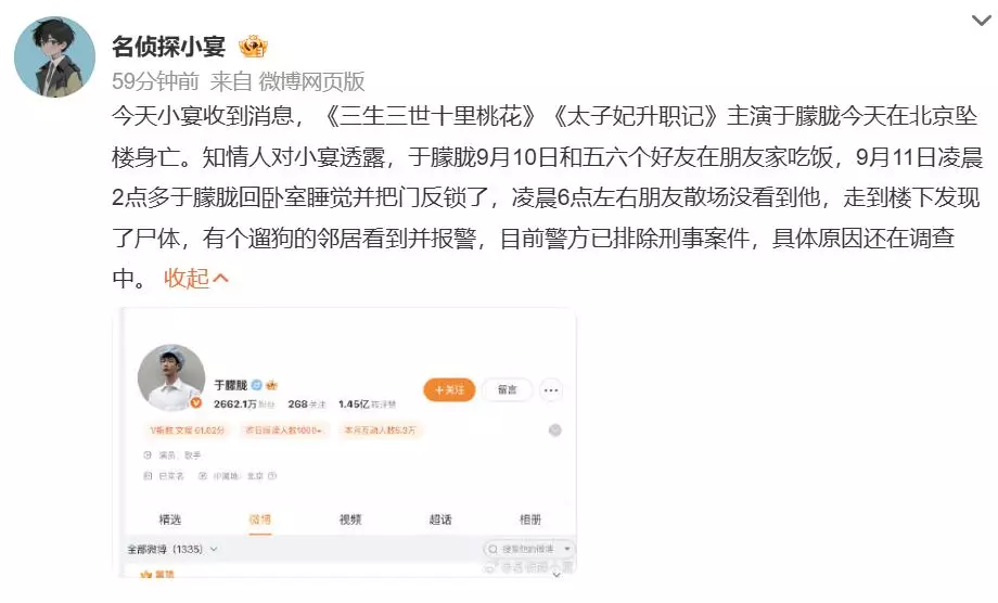 內地男演員于朦朧今日(9月11日)被爆於北京朝陽區墮樓身亡,終年37歲。其工作室於晚間發布聲明,于朦朧於今日墜樓身故,經警方調查已排除刑事案件嫌疑,願逝者安息,願生者堅強。