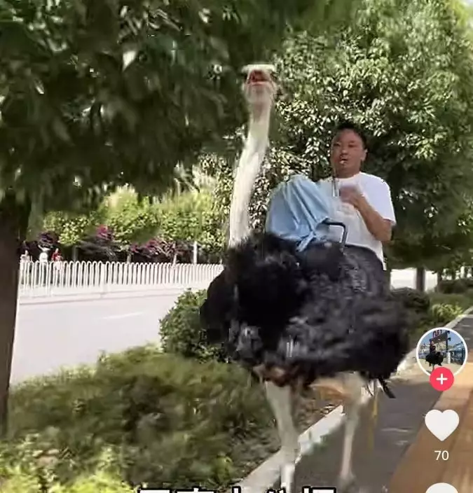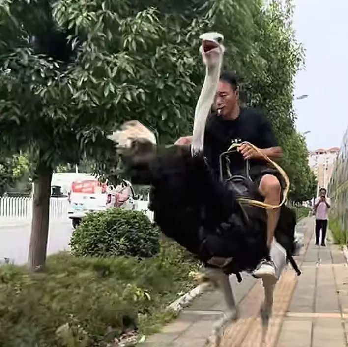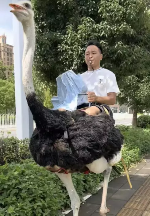 綜合內媒報導,雲南曲靖一名32歲男子阿華騎乘鴕鳥在馬路上疾馳的影片於近來在網上瘋傳。影片中,一隻黑身白頭白腿的鴕鳥在馬路上疾速奔跑,阿華口含哨子坐在牠的背上,畫面極為吸睛。片段上傳後附文寫道:「雲南十九怪,鴕鳥提速快」,引來網民熱烈討論。